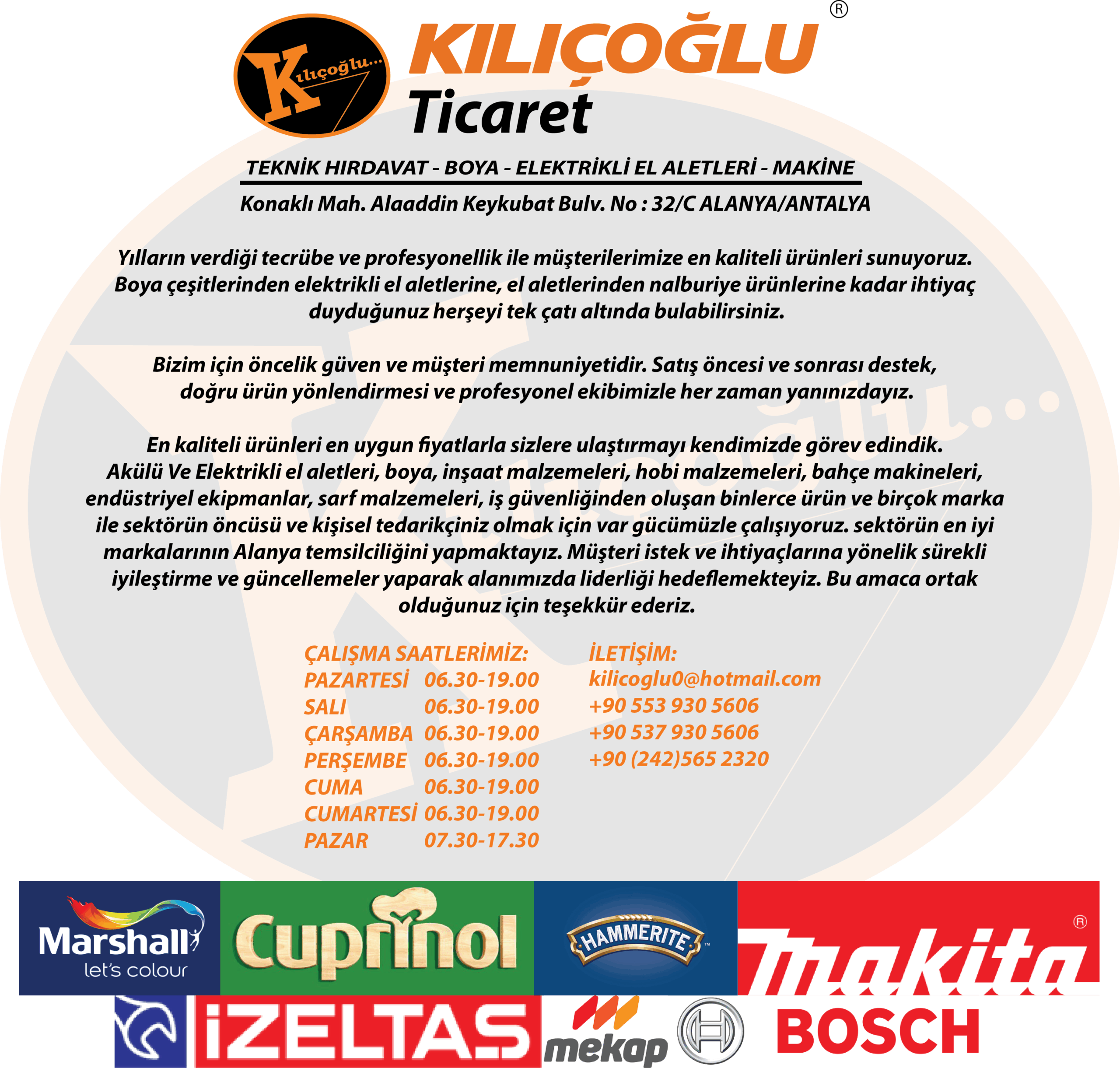 Kılıçoğlu Ticaret Olarak Bünyemizde Her türlü Teknik Hırdavat, sera ve inşaat malzemeleri, boya malzemeleri, sıhhi tesisat malzemeleri depo-market raf sistemleri, elektrikli el aletleri, mobilya aksesuarları, Marshall boya, Tek boya, Stella boya, DYO boya, bilgisayarlı oto boyaları ve anında renk sistemi, elektrik malzemeleri, banyo ve musluk armatürleri, otel-site ekipmanları iş güvenliği malzemeleri, vantilatör ve havalandırma sistemleri makine ve makine yedek parçaları ve binlerce çeşit ürün bulunmaktadır.